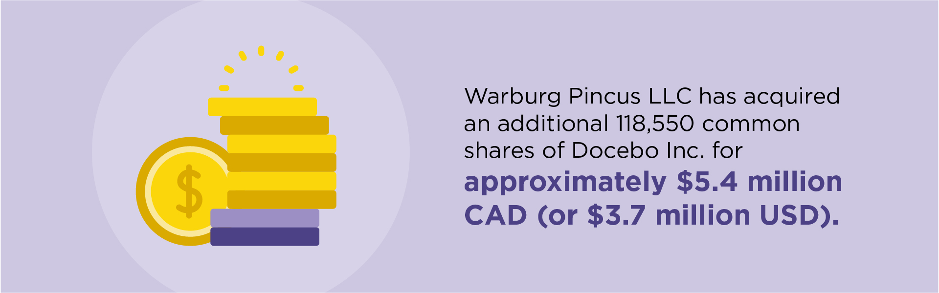- Warburg Pincus LLC has acquired an additional 118,550 common shares of Docebo Inc. for approximately $5.4 million CAD (or $3.7 million USD), at a price of $45.59 CAD per share. This brings Warburg’s total ownership to 3,630,715 shares, or about 12.01% of Docebo’s outstanding common shares, up from 11.62% before the purchase.