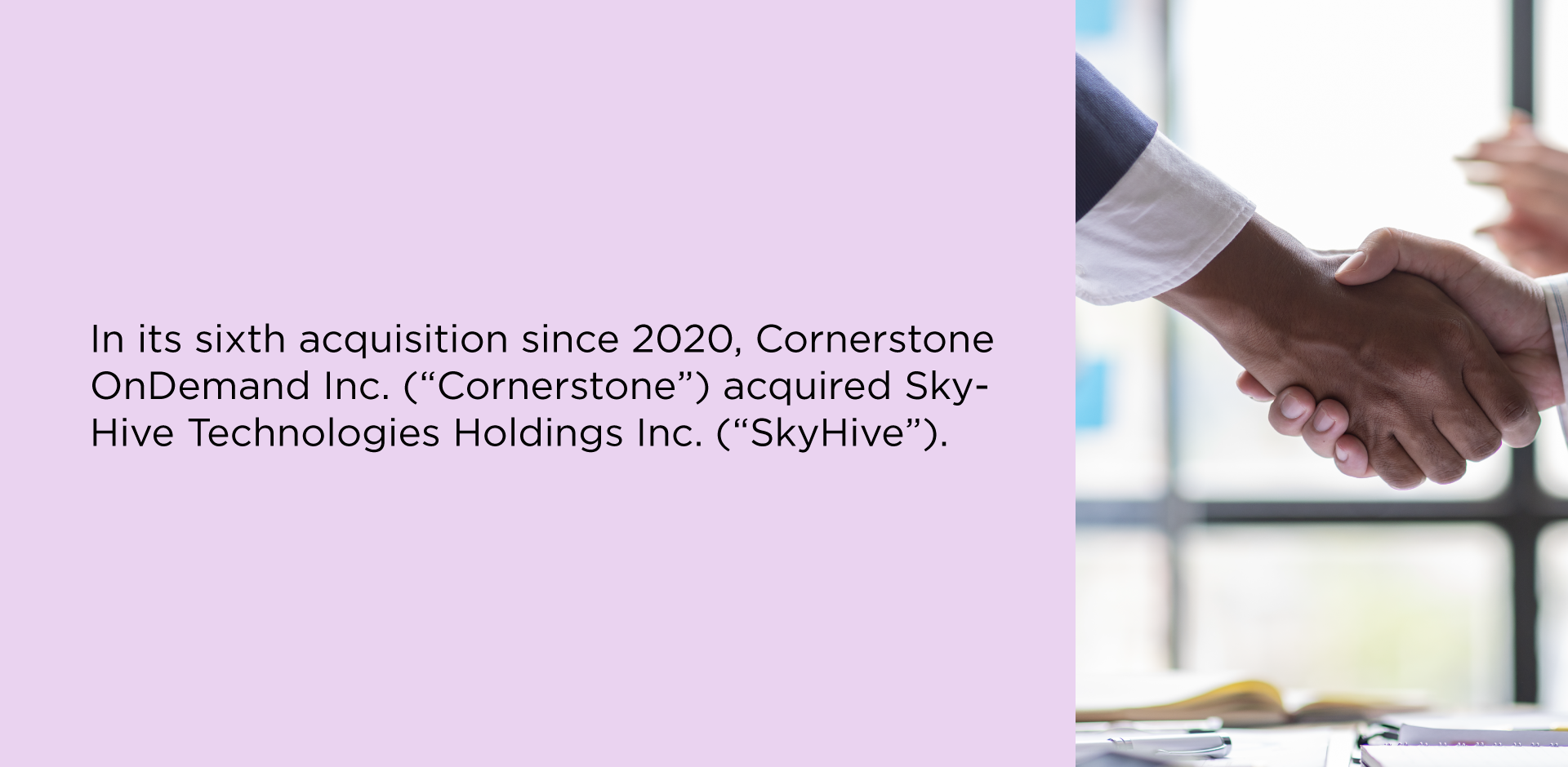 - In its sixth acquisition since 2020, Cornerstone OnDemand Inc. (“Cornerstone”) acquired SkyHive Technologies Holdings Inc. (“SkyHive”). The acquisition further positions Cornerstone as a leading provider of workforce agility solutions.