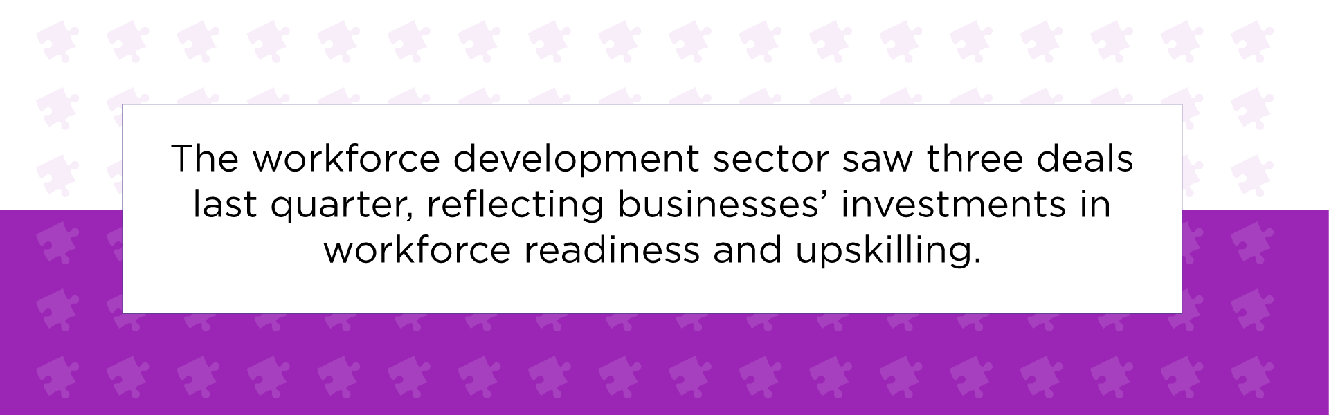 The workforce development sector saw three deals last quarter, reflecting businesses’ investments in workforce readiness and upskilling: