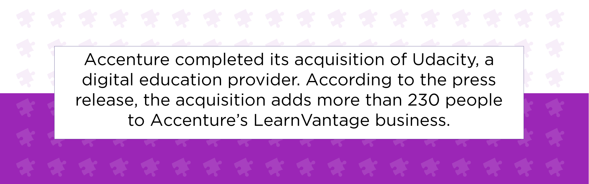 - Accenture completed its acquisition of Udacity, a digital education provider. According to the press release, the acquisition adds more than 230 people to Accenture’s LearnVantage business, bringing capabilities in integrating proprietary content, expert services and scalable learning technology, while bridging the gap between online education and workplace relevance.