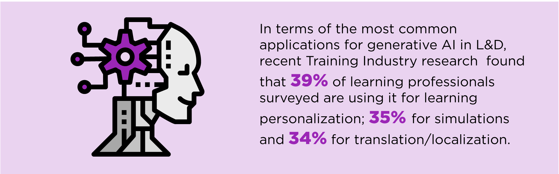 We expect more innovative, AI-driven learning solutions and technologies to hit the market throughout this year. In terms of the most common applications for generative AI in L&D, recent Training Industry research found that 39% of learning professionals surveyed are using it for learning personalization; 35% for simulations and 34% for translation/localization.