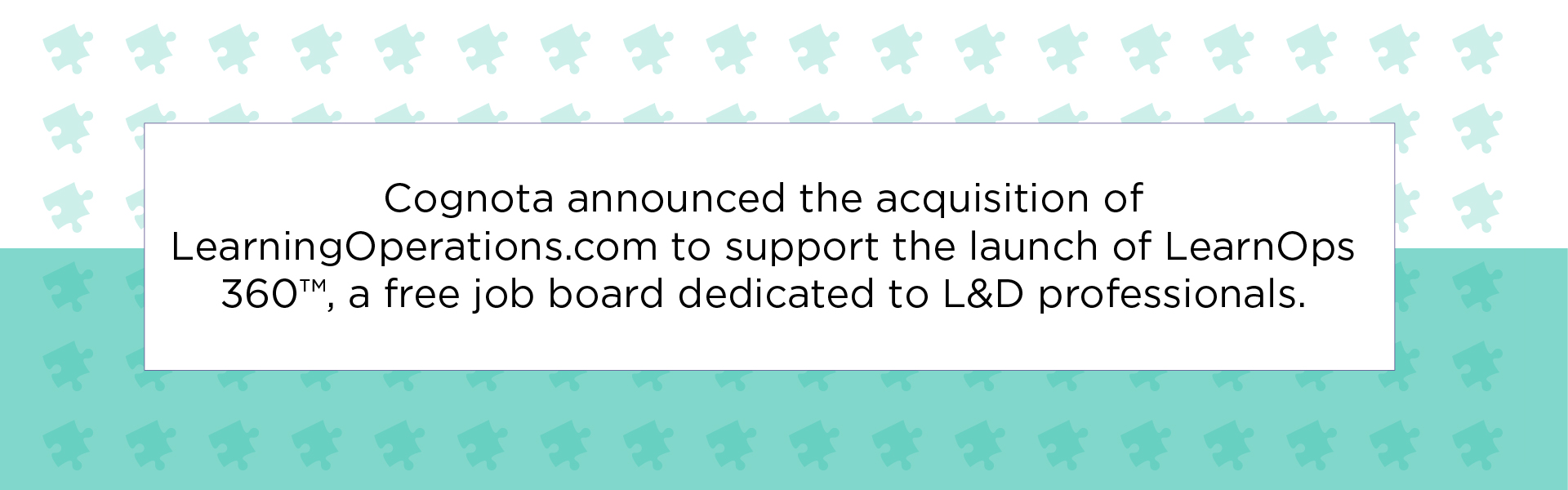 - Cognota announced the acquisition of LearningOperations.com to support the launch of LearnOps 360™, a free job board dedicated to L&D professionals. The job board aims to connect talented individuals in the L&D field with new career opportunities while continuing to support their growth and professional development through the LearnOps community.