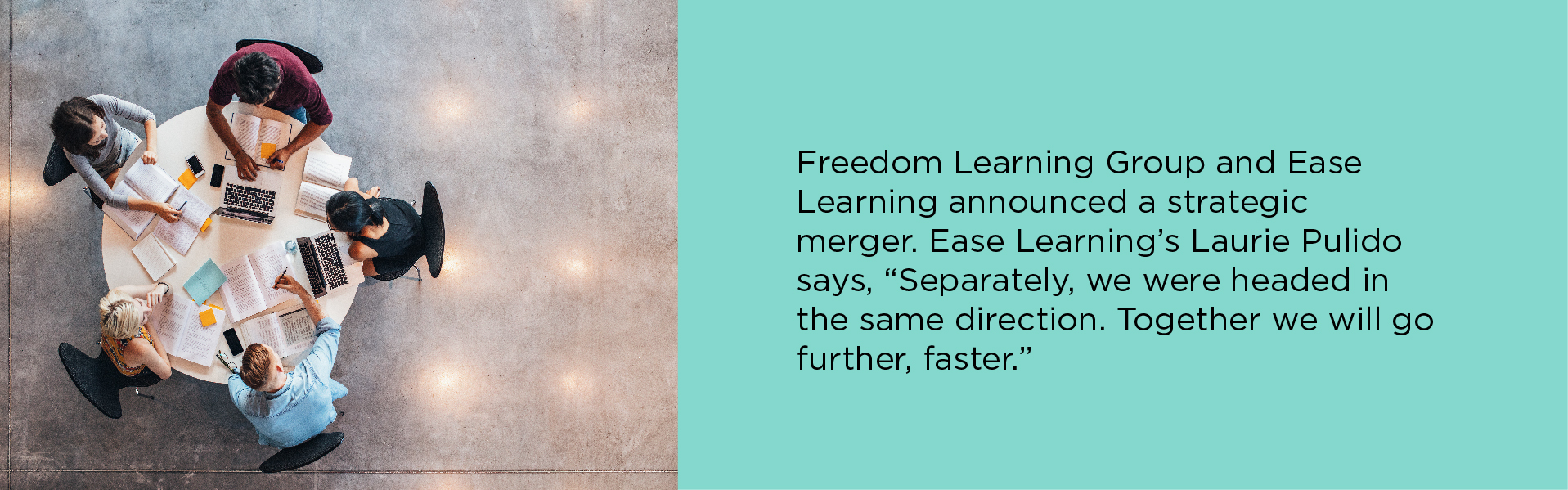 - Freedom Learning Group and Ease Learning announced a strategic merger of the two eLearning brands. “Over the past several months, it became abundantly clear that we are mission-aligned with complementary services,” said Ease Learning’s Laurie Pulido in the press release. “Separately, we were headed in the same direction. Together we will go further, faster.”