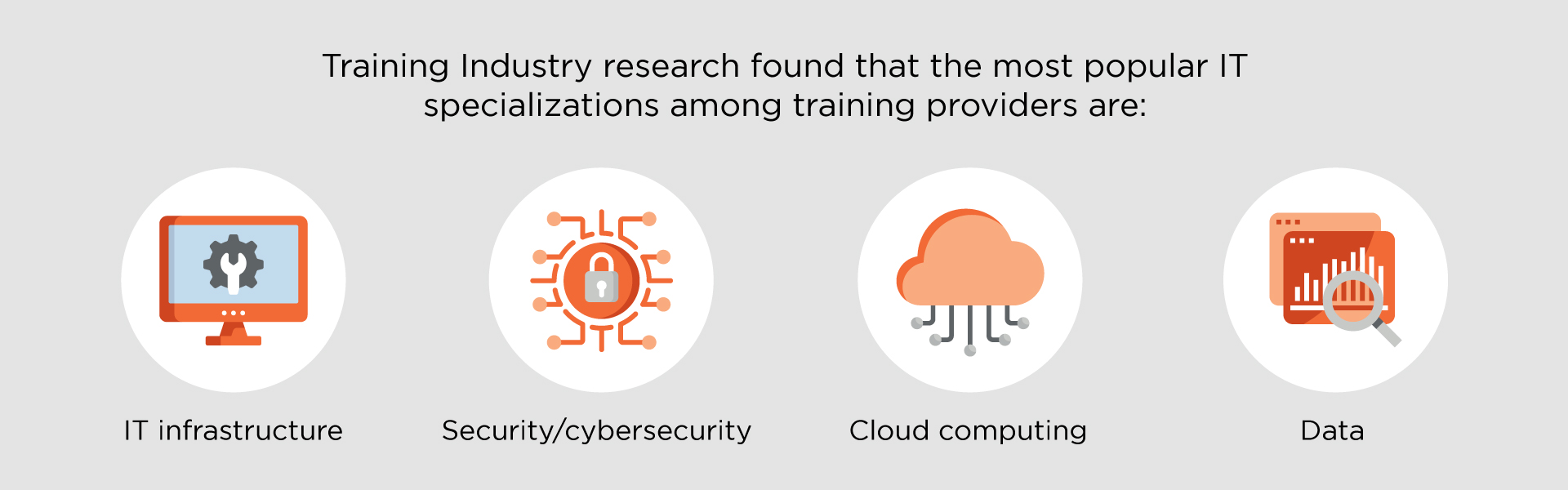 This segment of the market is vast, encompassing everything from cloud computing to data analytics training. According to Training Industry research, the most in-demand IT specializations are IT infrastructure, security/cybersecurity, cloud computing and data (e.g., data science, data analytics and big data).