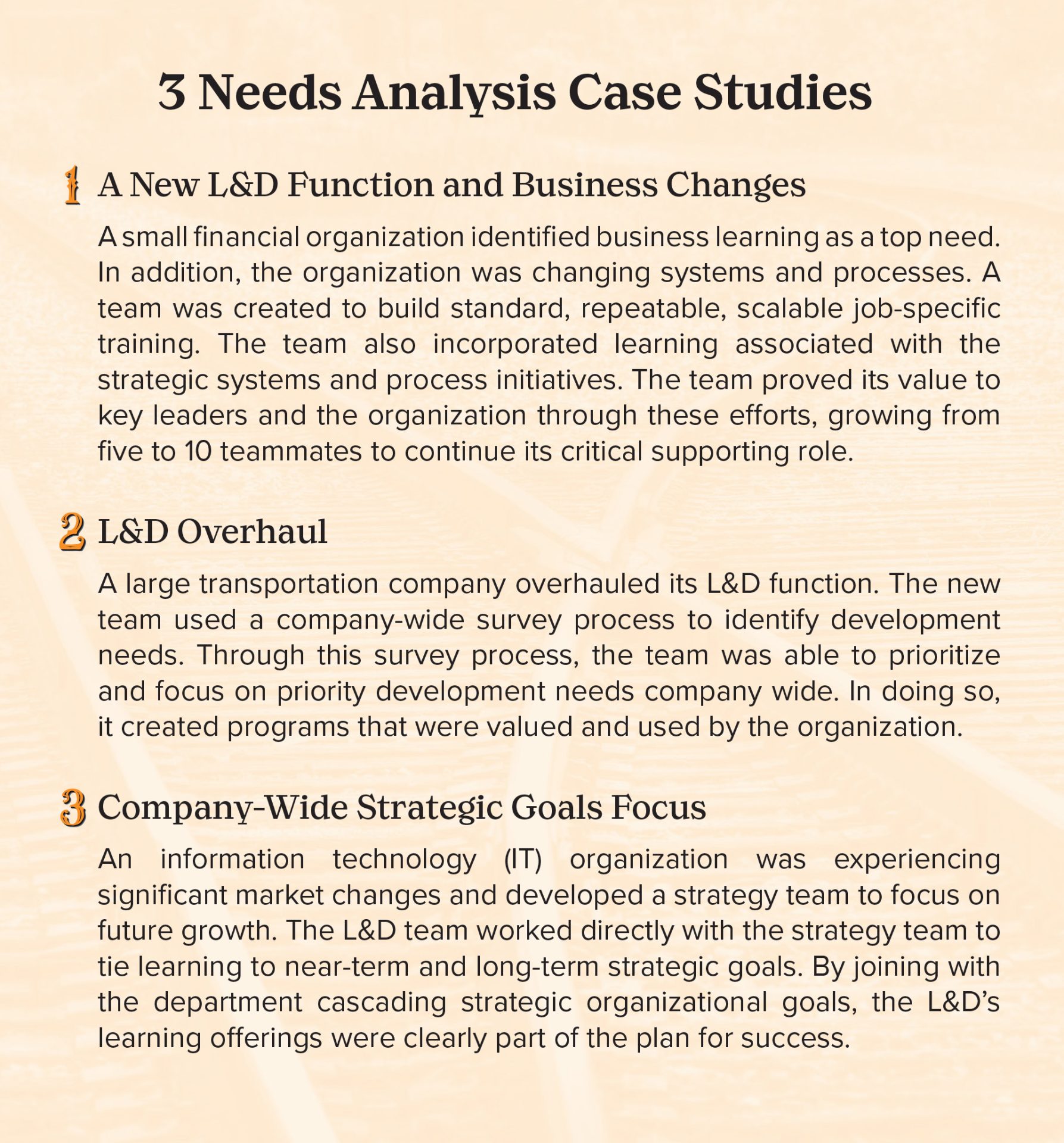 Starting with a strategic needs analysis, and doing it effectively and thoroughly, can make a significant difference in ensuring that learning and training efforts in your organization are valued and lead to tangible business results. When this happens, the learners, department and organizational leaders and the L&D function all win. Learners often receive targeted and applicable learning, department and organizational leaders see learning as an important business driver, and the L&D function gains that important seat at the table.
